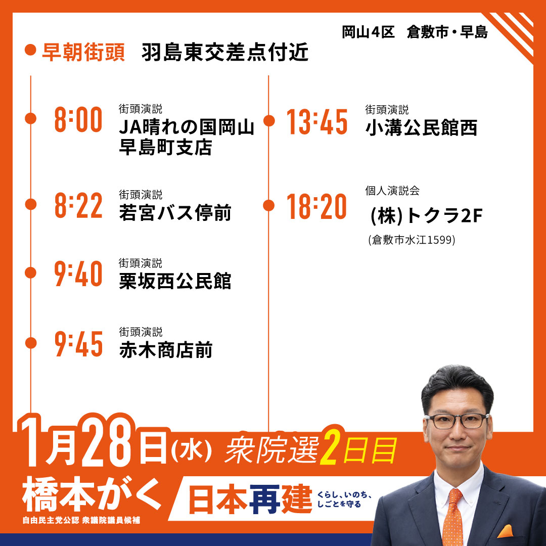 前回衆議院選挙の終盤、橋本がくは「私が自民党を叩き直します!」と熱を込めて訴えました。しかし力不足のため落選し、この想いを国会に届けることは叶いませんでした。さらに、令和7年夏の参院選挙でも、自民党は少数与党に転落しました。物価上昇等に対する対策や政治資金問題への対応について、国民の皆さまに不十分と評価された結果です。